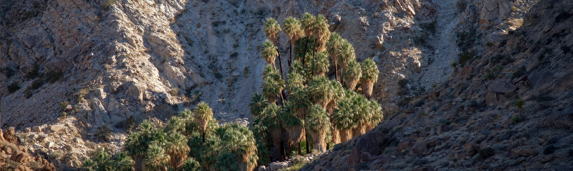 Fortynine Palms Oasis—A 1.5-mile trail climbs steadily over rugged hills from the town of Twentynine Palms before descending into a lush stand of California fan palms sustained by a natural spring. As one of five naturally occurring oases in Joshua Tree, the palms form a cool, shaded refuge for wildlife. Views along the way stretch across the desert toward the city of Twentynine Palms.