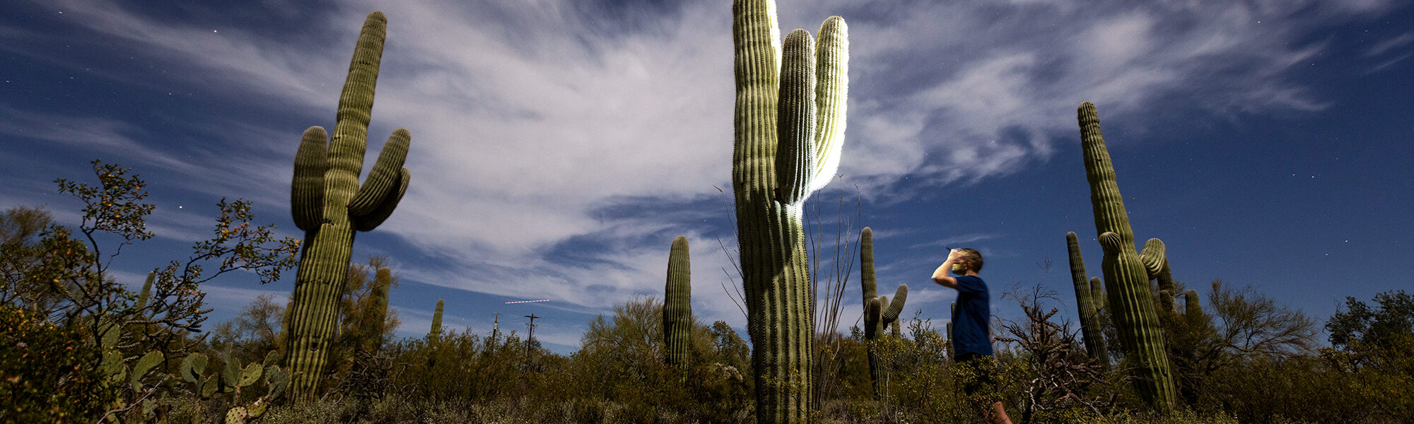 As the sun dips low, the high strands of clouds catch the colors—bright orange almost neon against the deep blue sky. The sun once again sparks every single cactus with a flash of gold in a final farewell before the land slips into shadow. Ecstatic with my shots, I drive back to camp ready for an early bedtime.
