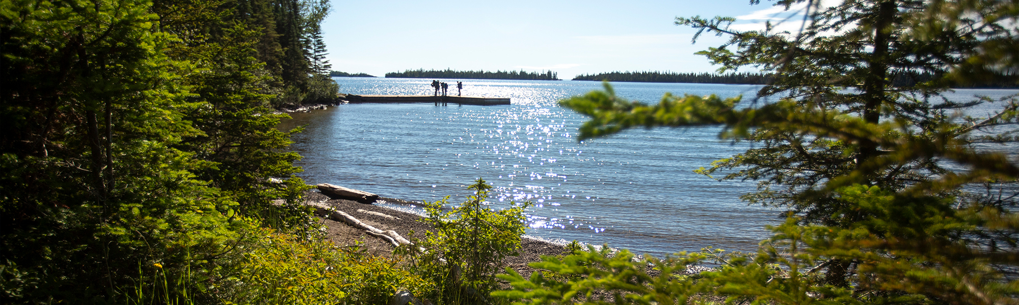 Soon enough we spy the faint silhouette of the ridgeline in the fog as we approach Isle Royale National Park—an ambivalent greeting for sure as I try to make out what kind of island excursion this will be. The captain pulls into Rock Harbor at 11:45 a.m. and unloads our gear. After a brief orientation from the ranger station, we head over to the Rock Harbor Lodge Dock to catch our 12:30 p.m. water taxi to Hidden Lake and kick off our backpacking adventure.